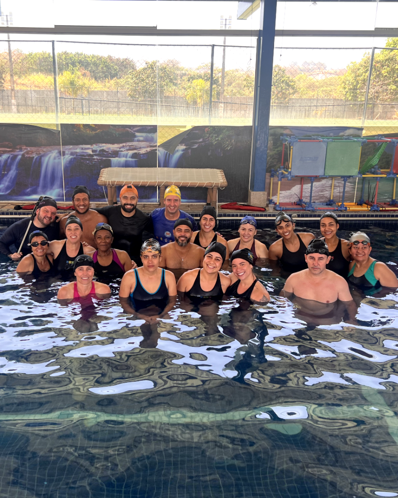 Após praticarem o passo a passo, o time recebeu os alunos que se disponibilizaram para participar do Workshop e superarem o medo da água. Marcos apresentou o mesmo conteúdo aos alunos, que foram direcionados aos seus professores para praticarem a técnica.